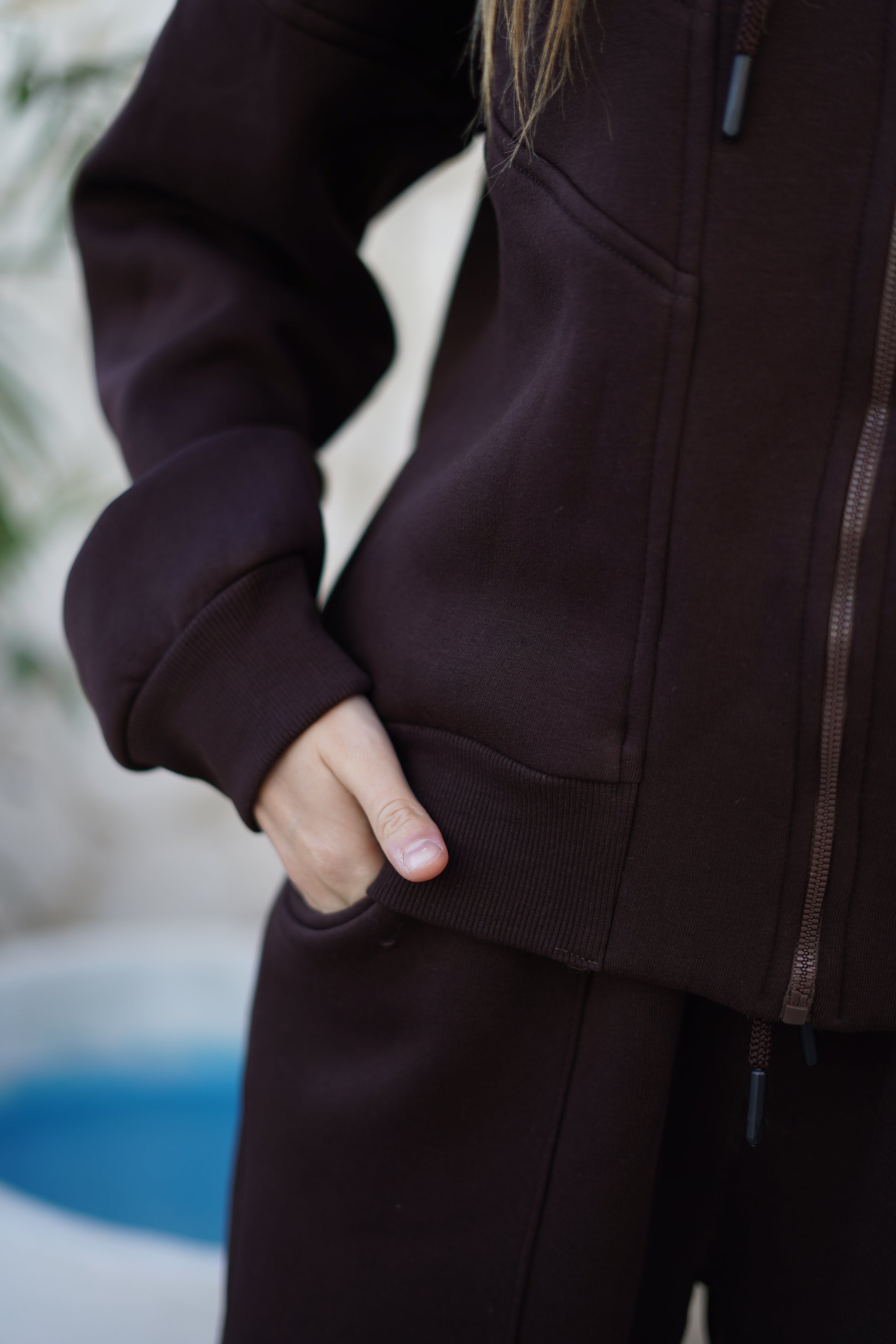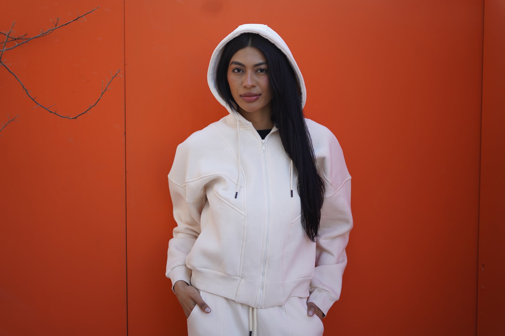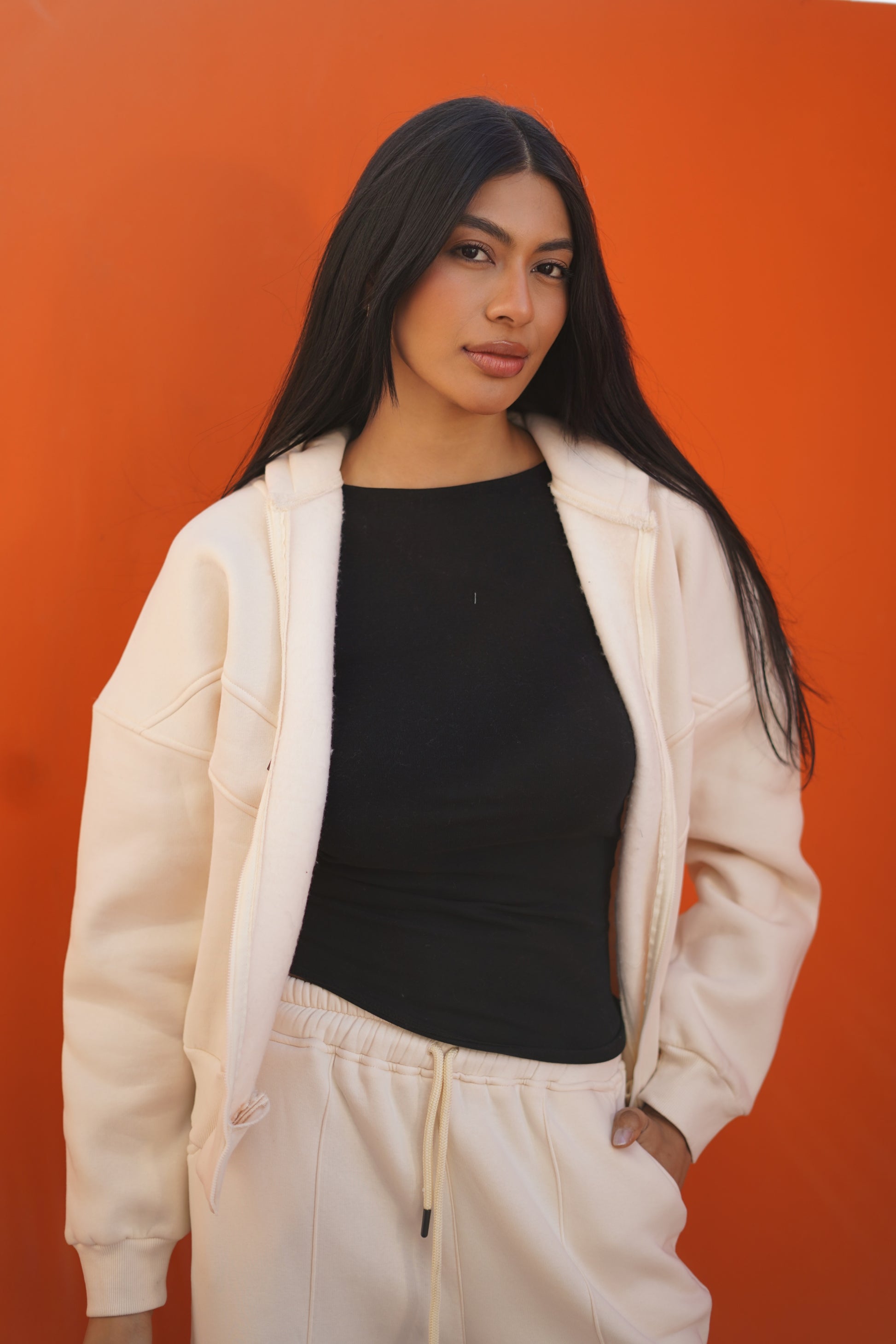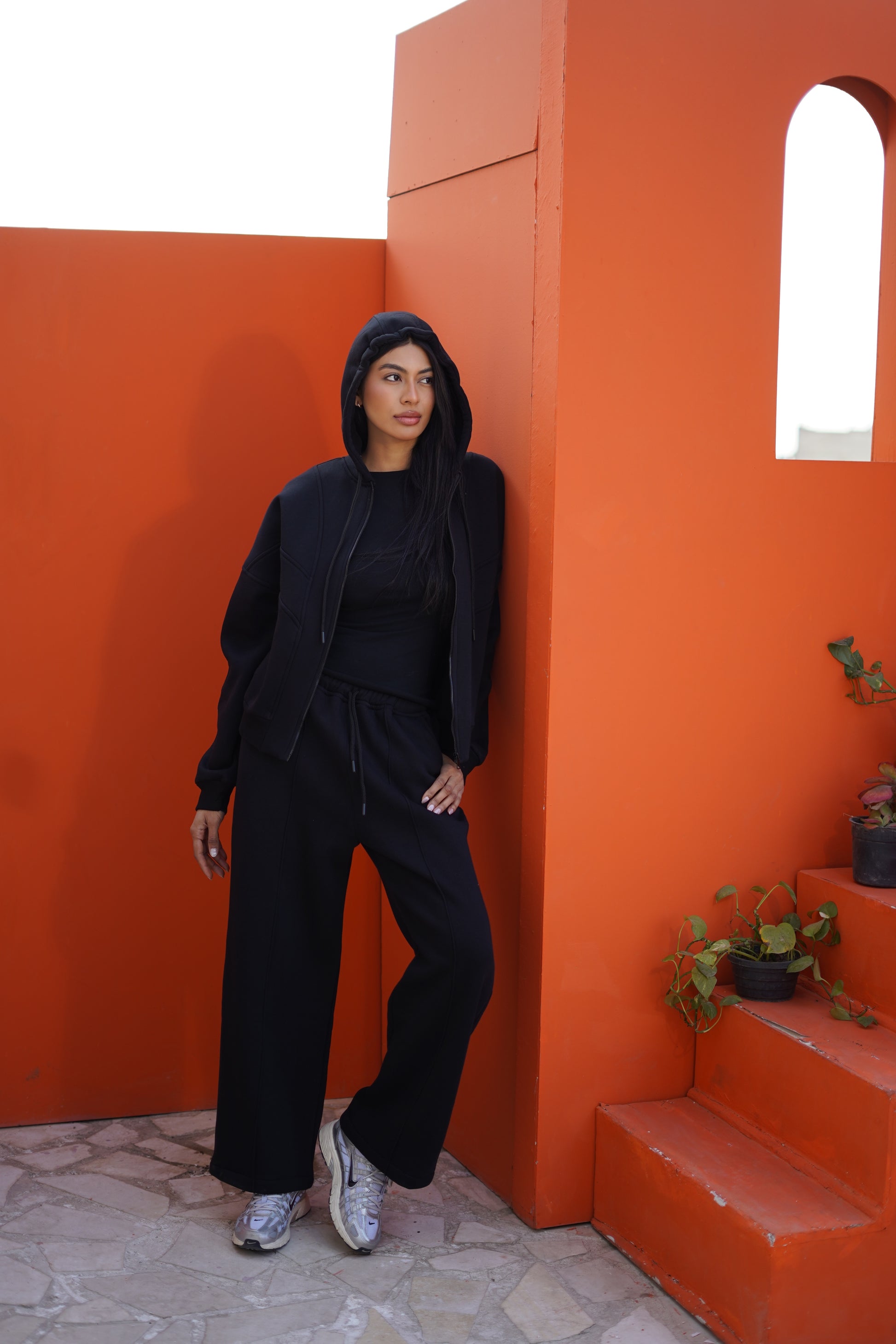 The hoodie features a relaxed fit, full zip closure, and practical pockets, while the matching wide-leg pants deliver comfort and flow with every step.